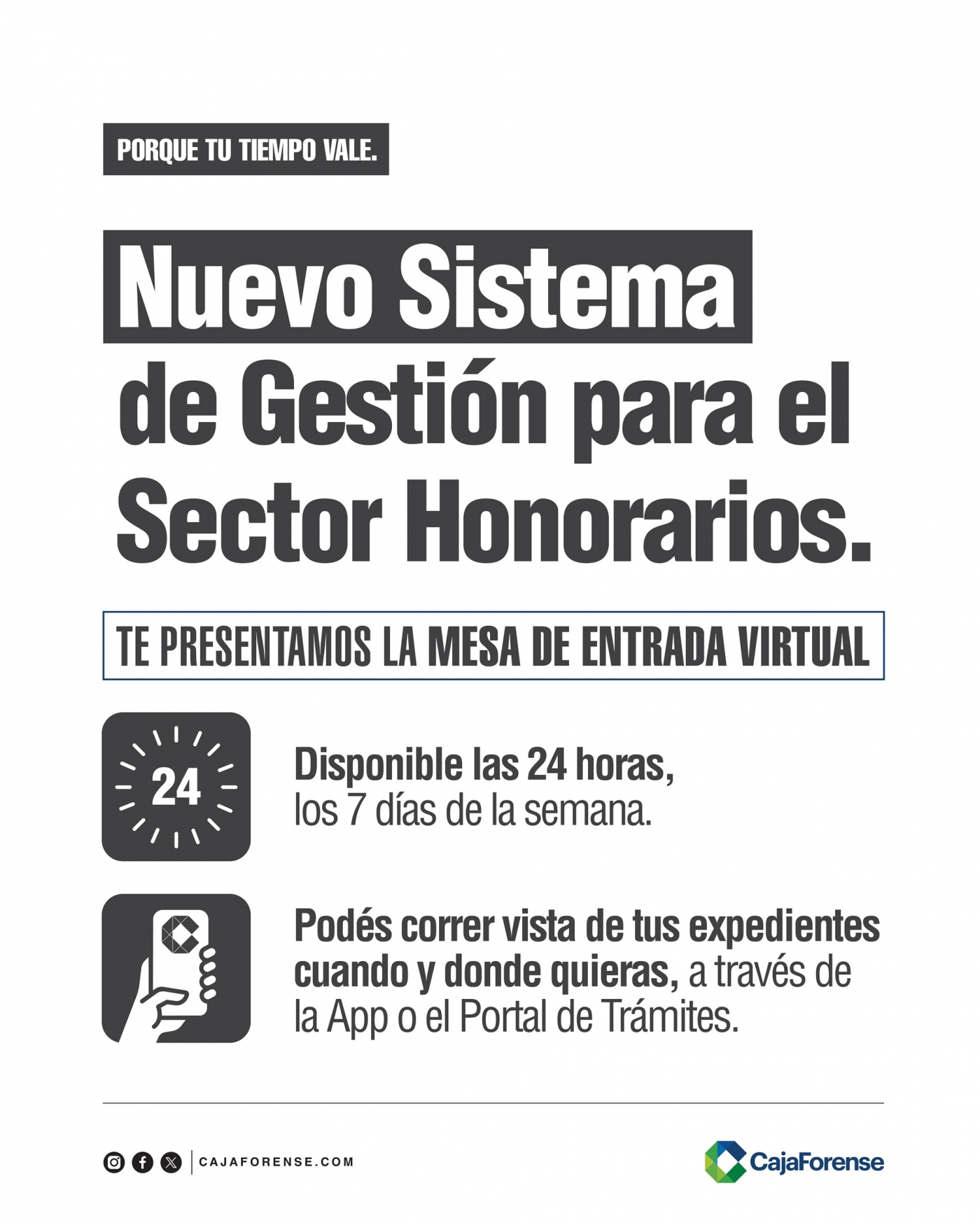El nuevo sistema habilita una Mesa de Entrada Virtual de funcionamiento ininterrumpido — disponible las 24 horas, los 7 días de la semana —, a través de la cual los abogados y procuradores podrán correr vista de sus expedientes a Caja Forense para la regulación de honorarios, sin necesidad de concurrir personalmente ni ajustarse al horario de atención al público.